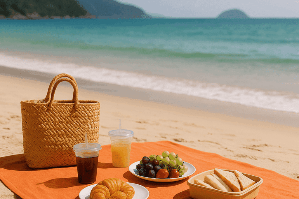 Ninguém quer espalhar comida na areia, não é mesmo? Por isso, a nossa dica é que você use a canga como um apoio limpo e funcional. Para isso, dobre-a em um retângulo e use como toalha de piquenique de praia. Coloque as bolsas, copos, pratos e comidas sobre ela. Assim, você mantém tudo organizado e evita contato direto com a areia.