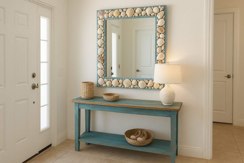 - Como aplicar: na entrada da casa, coloque um espelho com moldura temática (como madeira azul ou conchas coladas à mão) para receber os hóspedes com um toque visual interessante. Além de decorativo, esse espelho ajuda os visitantes a se arrumarem antes de sair.