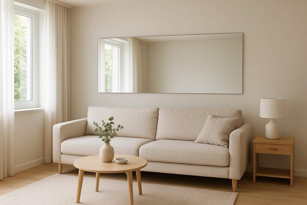 - Como aplicar? Na sala de estar, que pode ter cerca de 9 a 12 m², um espelho retangular simples, sem moldura, pode ser instalado horizontalmente acima do sofá. Esse espelho vai refletir a janela lateral e criar a sensação de amplitude.
