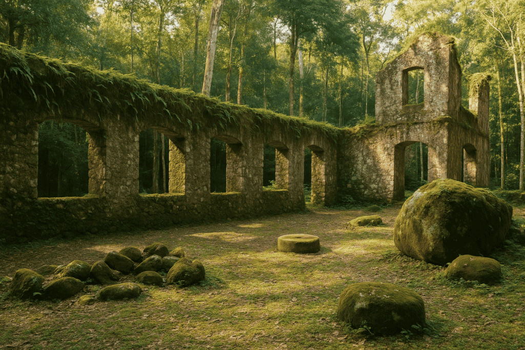 - Raízes e árvores centenárias que se misturam aos muros, criando um cenário quase surreal;